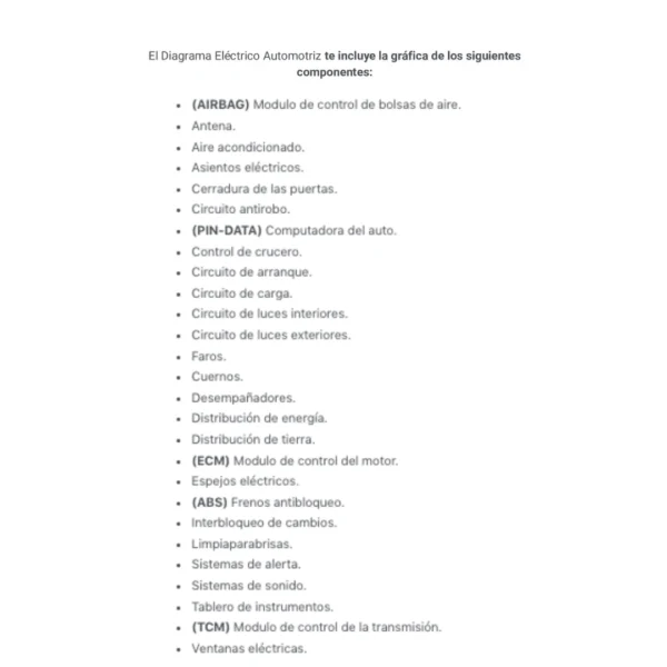 El Diagrama Eléctrico Automotriz te incluye la gráfica de los siguientes componentes: