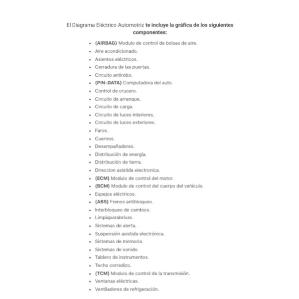 El Diagrama Eléctrico Automotriz te incluye la gráfica de los siguientes componentes:
