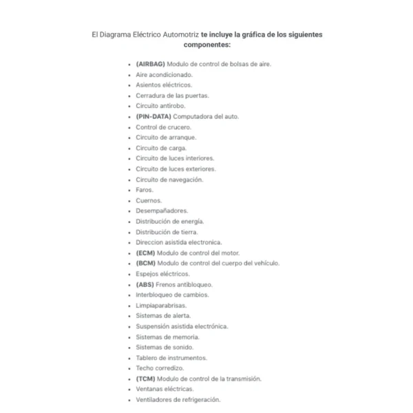 El Diagrama Eléctrico Automotriz te incluye la gráfica de los siguientes componentes: