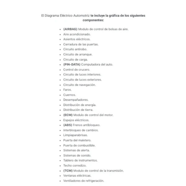 El Diagrama Eléctrico Automotriz te incluye la gráfica de los siguientes componentes: