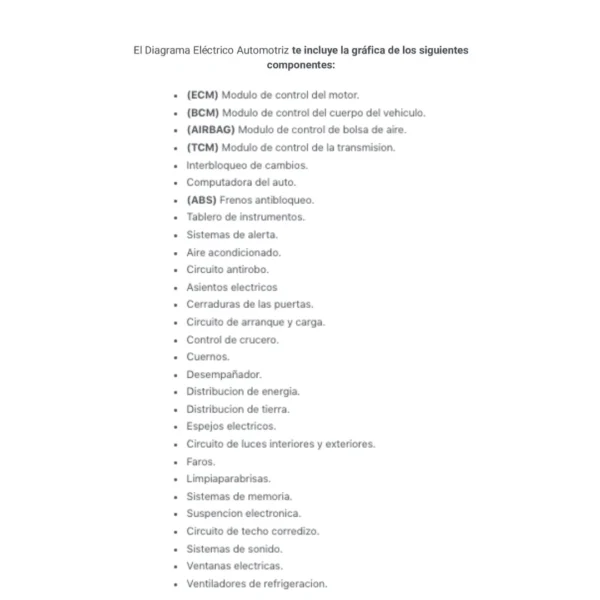 El Diagrama Eléctrico Automotriz te incluye la gráfica de los siguientes componentes: