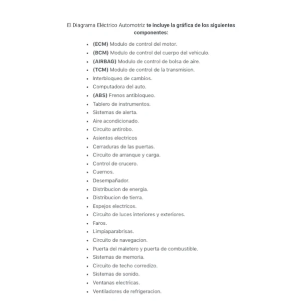El Diagrama Eléctrico Automotriz te incluye la gráfica de los siguientes componentes:
