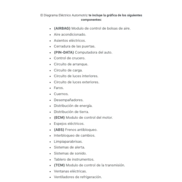 El Diagrama Eléctrico Automotriz te incluye la gráfica de los siguientes componentes: