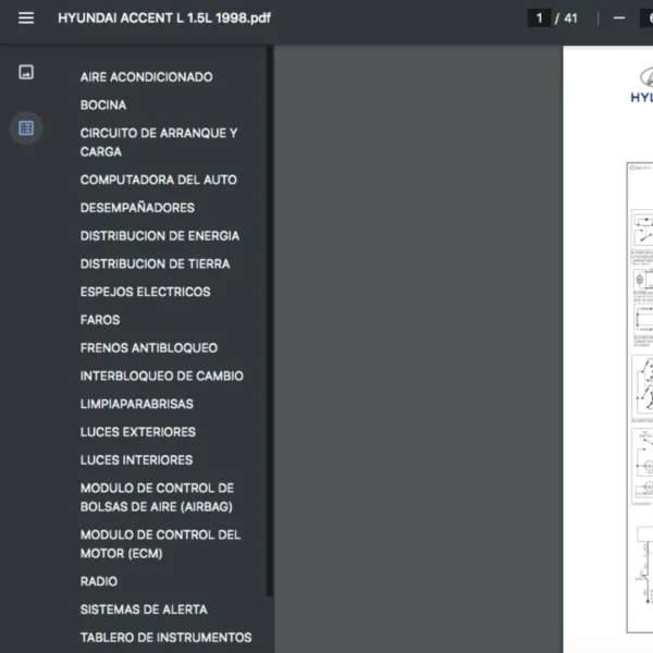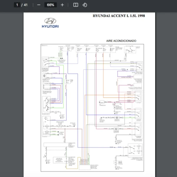 Conexiones. Sensores. Y otros componentes que intervienen en el funcionamiento correcto de los circuitos electrónicos (también llamados en inglés “wiring diagram”). Si estas buscando un manual eléctrico de la marca Hyundai modelo Accent de 1.5L año 1998 , este es el diagrama automotriz que necesitas.