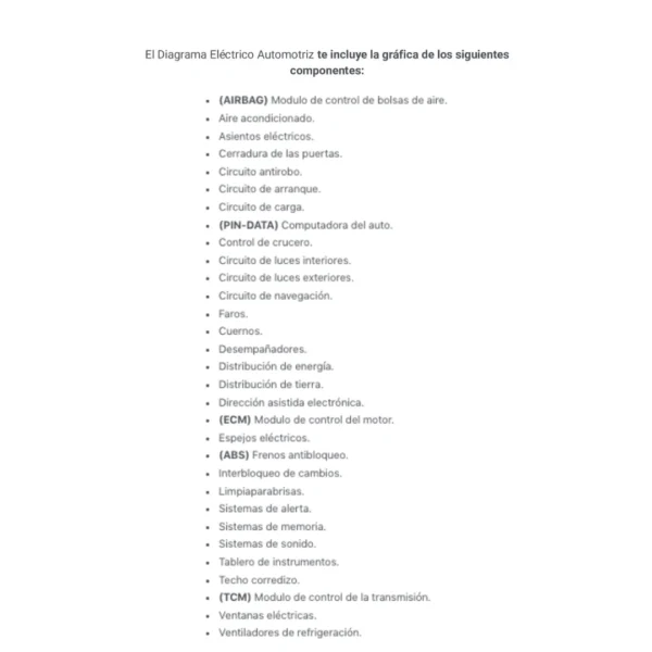 El Diagrama Eléctrico Automotriz te incluye la gráfica de los siguientes componentes: