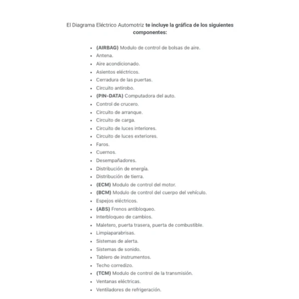 El Diagrama Eléctrico Automotriz te incluye la gráfica de los siguientes componentes: