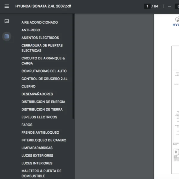 Si estas buscando un manual eléctrico de la marca Hyundai modelo Sonata de 2.4L año 2007, este es el diagrama automotriz que necesitas.