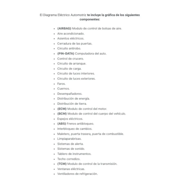 El Diagrama Eléctrico Automotriz te incluye la gráfica de los siguientes componentes: