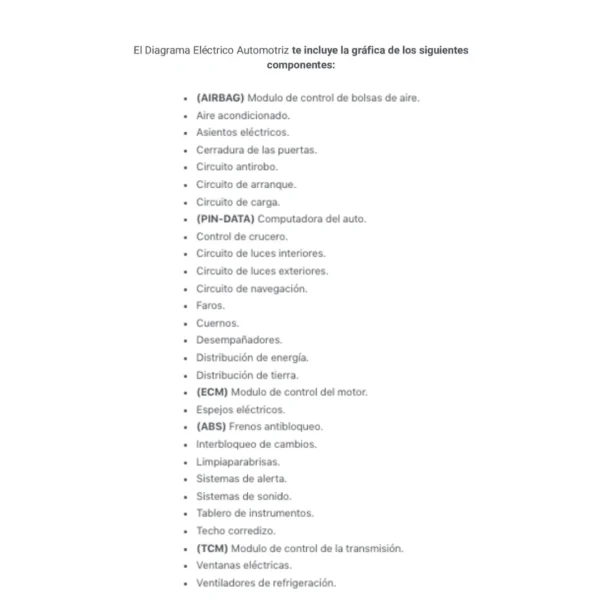El Diagrama Eléctrico Automotriz te incluye la gráfica de los siguientes componentes: