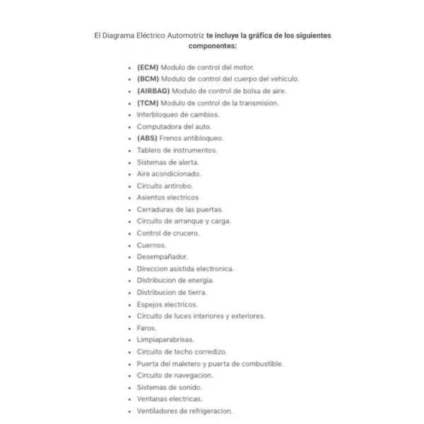 El Diagrama Eléctrico Automotriz te incluye la gráfica de los siguientes componentes:
