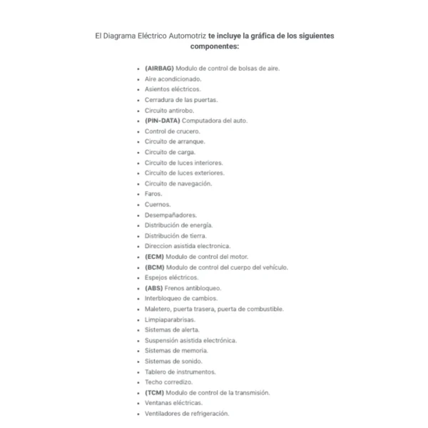 El Diagrama Eléctrico Automotriz te incluye la gráfica de los siguientes componentes: