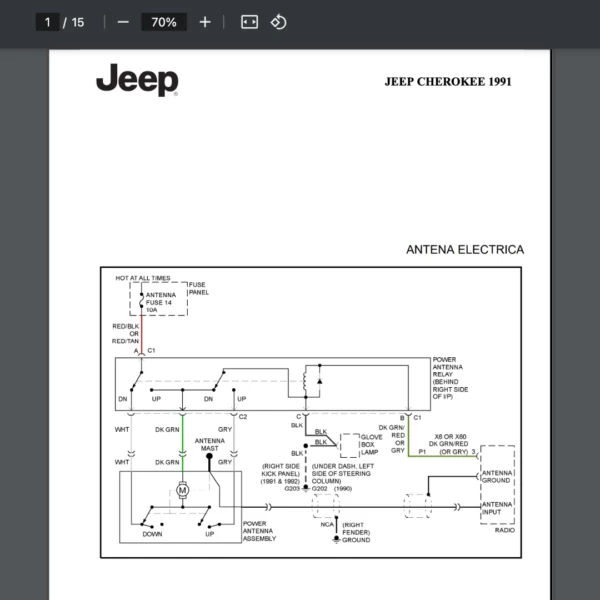 Conexiones. Sensores. Y otros componentes que intervienen en el funcionamiento correcto de los circuitos electrónicos (también llamados en inglés “wiring diagram”). Si estas buscando un manual eléctrico de la marca Jeep modelo Cherokee año 1991 , este es el diagrama automotriz que necesitas.
