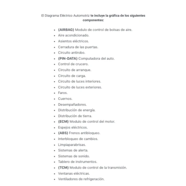 El Diagrama Eléctrico Automotriz te incluye la gráfica de los siguientes componentes: