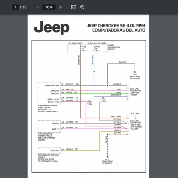 Si estas buscando un manual eléctrico de la marca Jeep modelo Cherokee de 4.0L año 1994, este es el diagrama automotriz que necesitas.