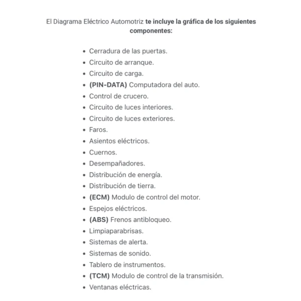 El Diagrama Eléctrico Automotriz te incluye la gráfica de los siguientes componentes:
