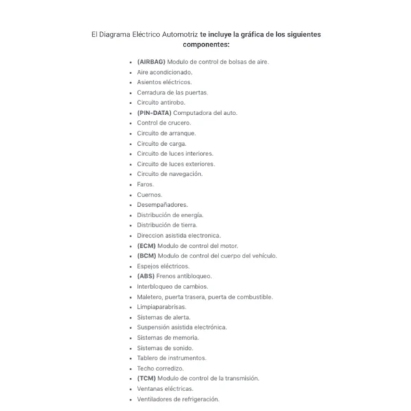El Diagrama Eléctrico Automotriz te incluye la gráfica de los siguientes componentes: