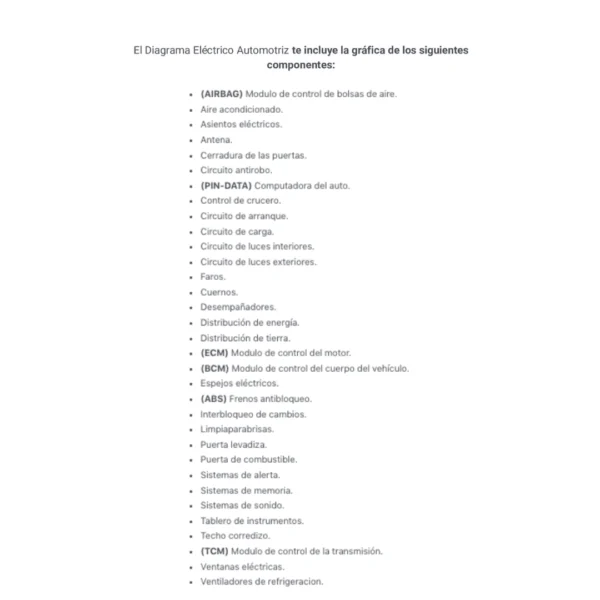 El Diagrama Eléctrico Automotriz te incluye la gráfica de los siguientes componentes: