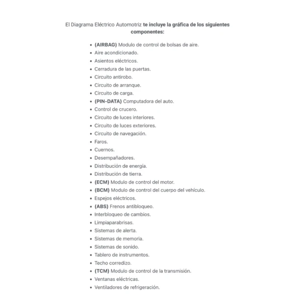 El Diagrama Eléctrico Automotriz te incluye la gráfica de los siguientes componentes: