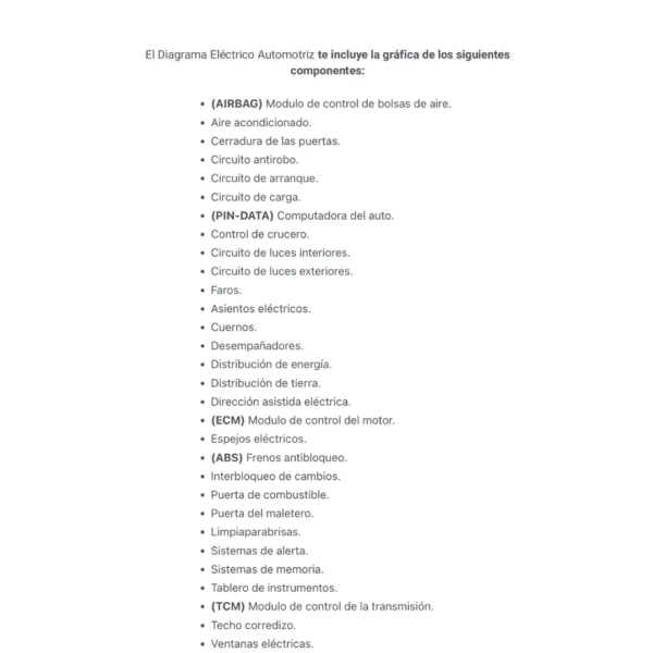 El Diagrama Eléctrico Automotriz te incluye la gráfica de los siguientes componentes: