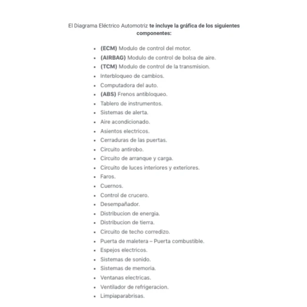 El Diagrama Eléctrico Automotriz te incluye la gráfica de los siguientes componentes: