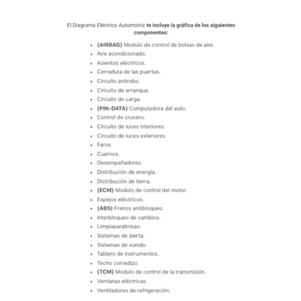 El Diagrama Eléctrico Automotriz te incluye la gráfica de los siguientes componentes: