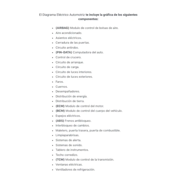 El Diagrama Eléctrico Automotriz te incluye la gráfica de los siguientes componentes: