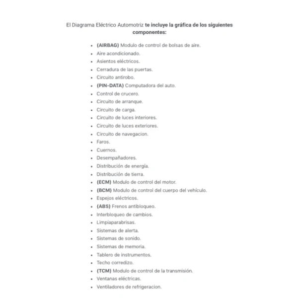 El Diagrama Eléctrico Automotriz te incluye la gráfica de los siguientes componentes: