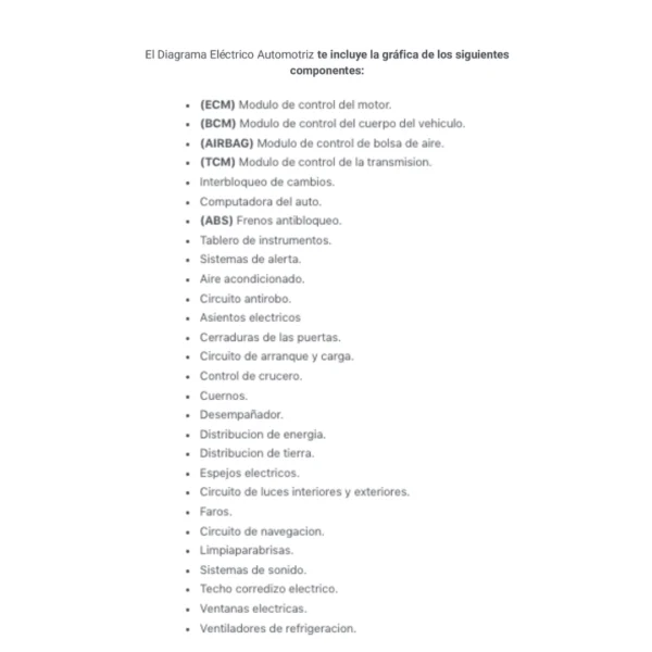 El Diagrama Eléctrico Automotriz te incluye la gráfica de los siguientes componentes: