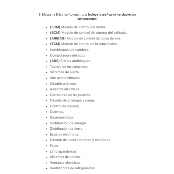 El Diagrama Eléctrico Automotriz te incluye la gráfica de los siguientes componentes: