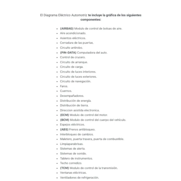 El Diagrama Eléctrico Automotriz te incluye la gráfica de los siguientes componentes: