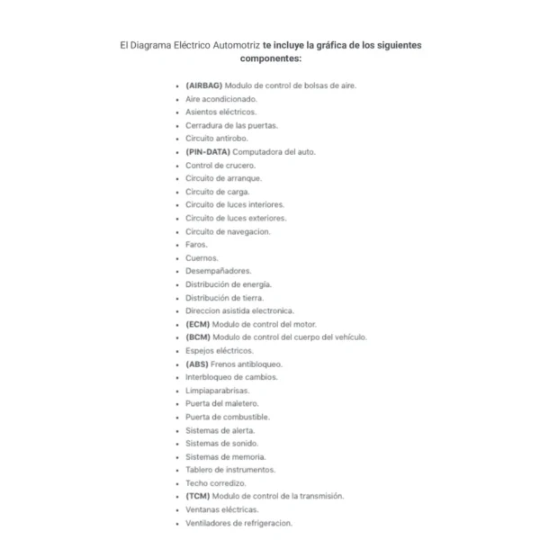 El Diagrama Eléctrico Automotriz te incluye la gráfica de los siguientes componentes: