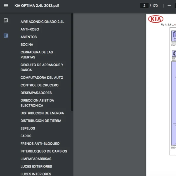 Si estas buscando un manual eléctrico de la marca Kia modelo Optima de 2.4L año 2013, este es el diagrama automotriz que necesitas.