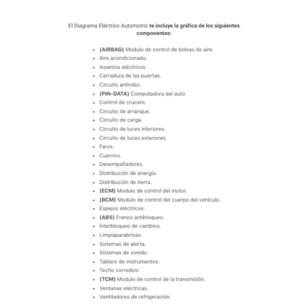 El Diagrama Eléctrico Automotriz te incluye la gráfica de los siguientes componentes: