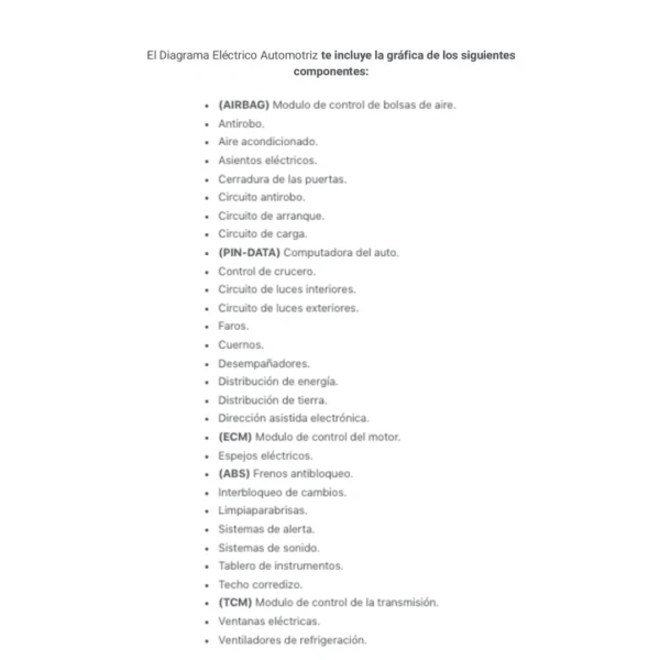 El Diagrama Eléctrico Automotriz te incluye la gráfica de los siguientes componentes: