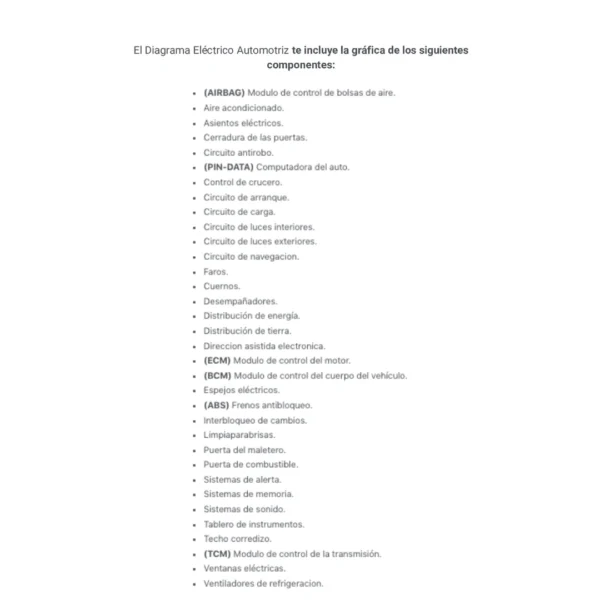 El Diagrama Eléctrico Automotriz te incluye la gráfica de los siguientes componentes: