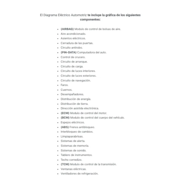 El Diagrama Eléctrico Automotriz te incluye la gráfica de los siguientes componentes: