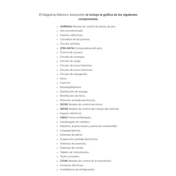 El Diagrama Eléctrico Automotriz te incluye la gráfica de los siguientes componentes: