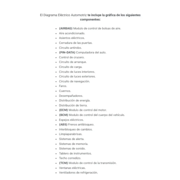 El Diagrama Eléctrico Automotriz te incluye la gráfica de los siguientes componentes:
