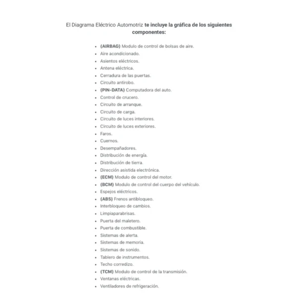 El Diagrama Eléctrico Automotriz te incluye la gráfica de los siguientes componentes: