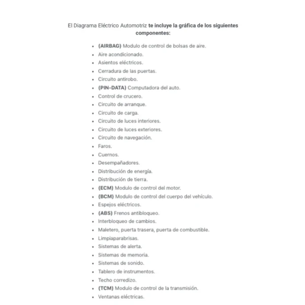 El Diagrama Eléctrico Automotriz te incluye la gráfica de los siguientes componentes: