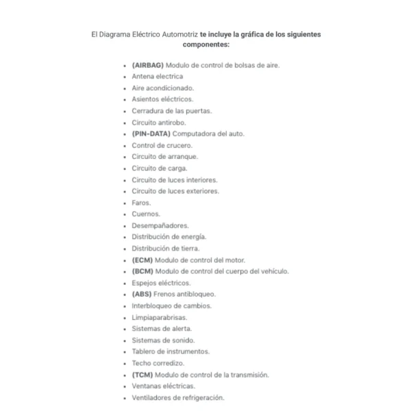 El Diagrama Eléctrico Automotriz te incluye la gráfica de los siguientes componentes:
