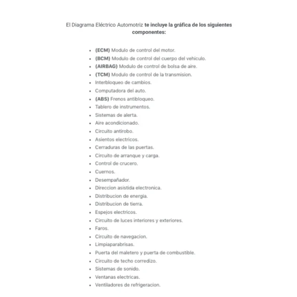 El Diagrama Eléctrico Automotriz te incluye la gráfica de los siguientes componentes: