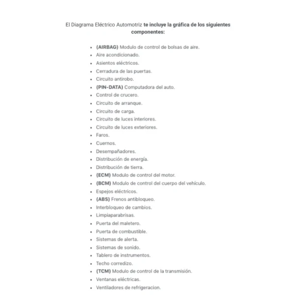 El Diagrama Eléctrico Automotriz te incluye la gráfica de los siguientes componentes: