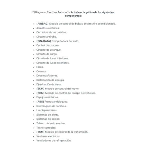 El Diagrama Eléctrico Automotriz te incluye la gráfica de los siguientes componentes: