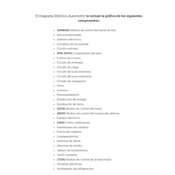 El Diagrama Eléctrico Automotriz te incluye la gráfica de los siguientes componentes: