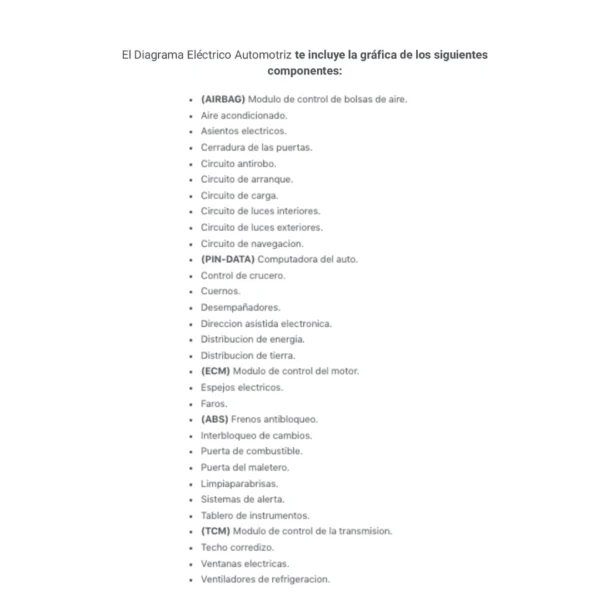 El Diagrama Eléctrico Automotriz te incluye la gráfica de los siguientes componentes: