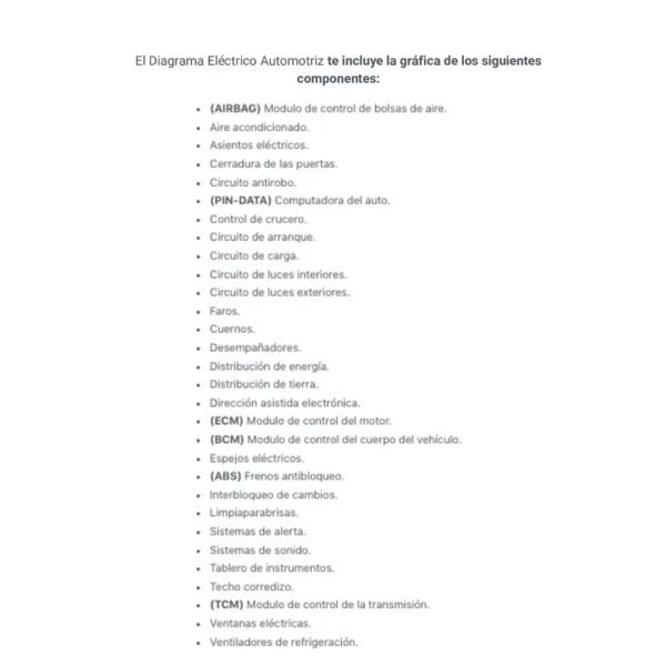 El Diagrama Eléctrico Automotriz te incluye la gráfica de los siguientes componentes: