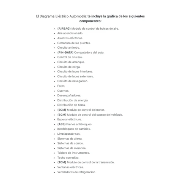 El Diagrama Eléctrico Automotriz te incluye la gráfica de los siguientes componentes: