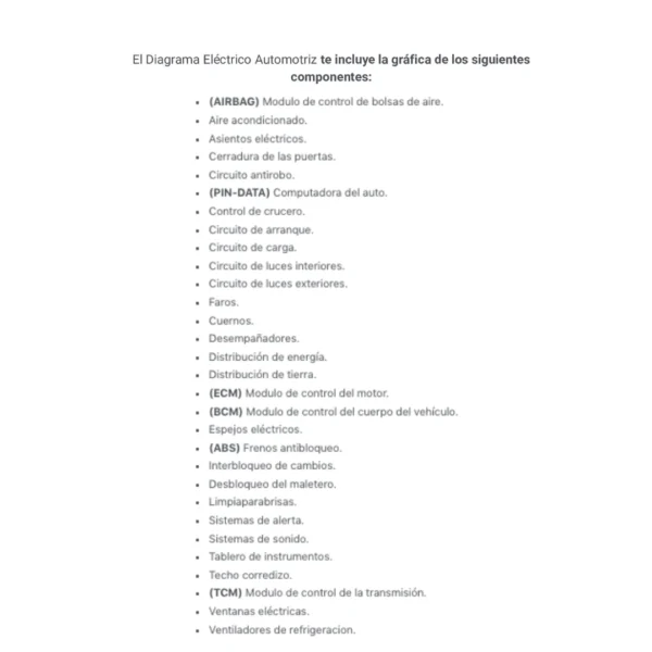 El Diagrama Eléctrico Automotriz te incluye la gráfica de los siguientes componentes: