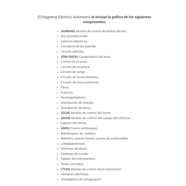 El Diagrama Eléctrico Automotriz te incluye la gráfica de los siguientes componentes: